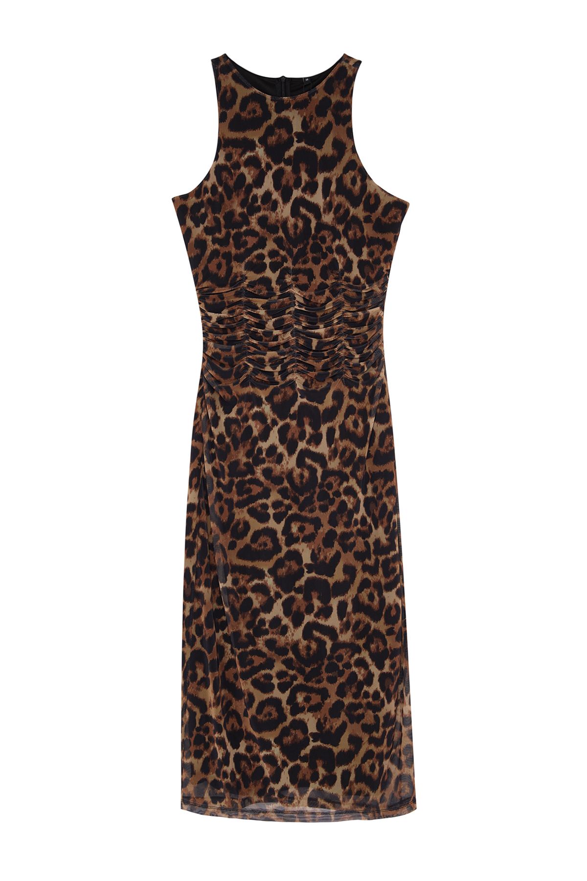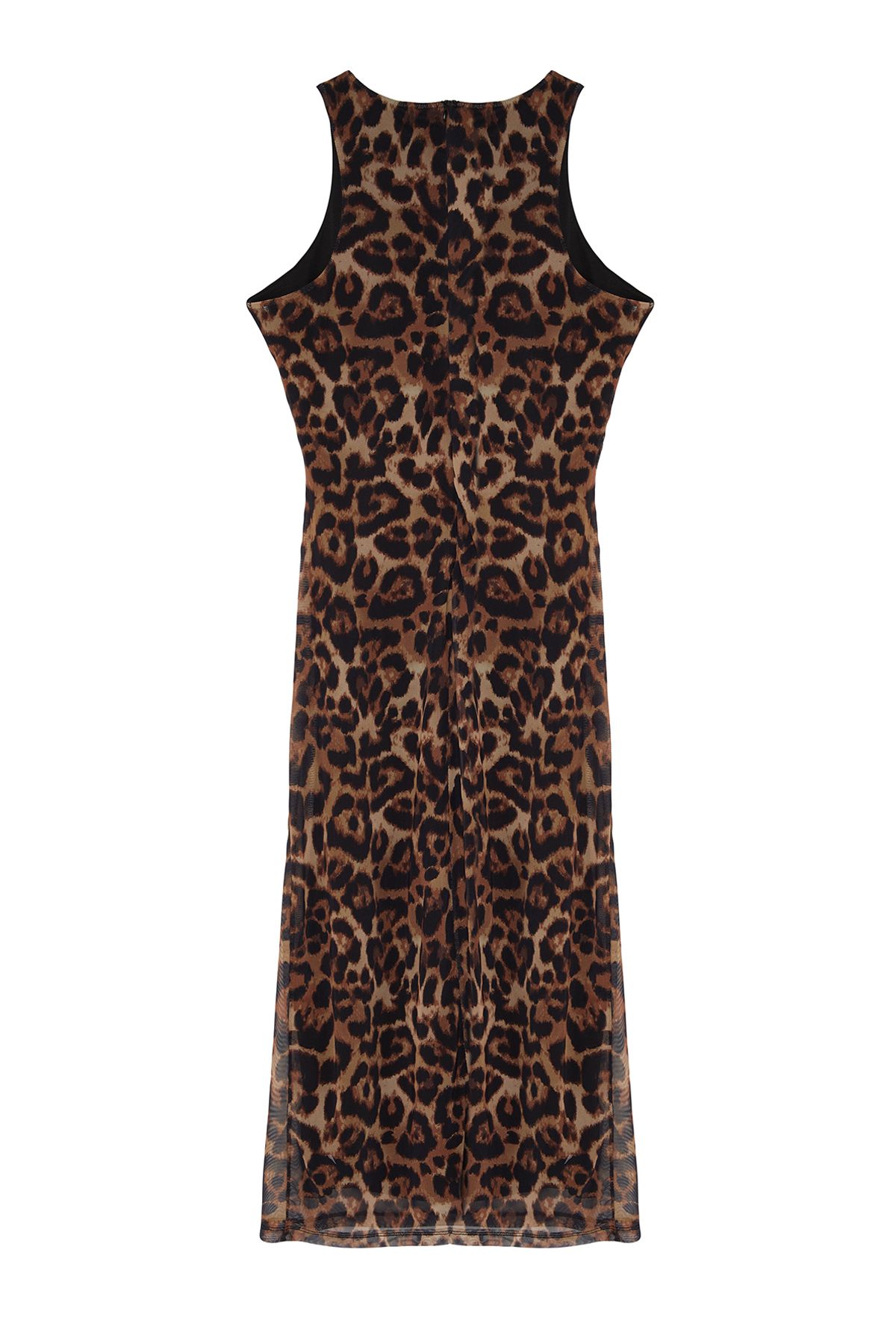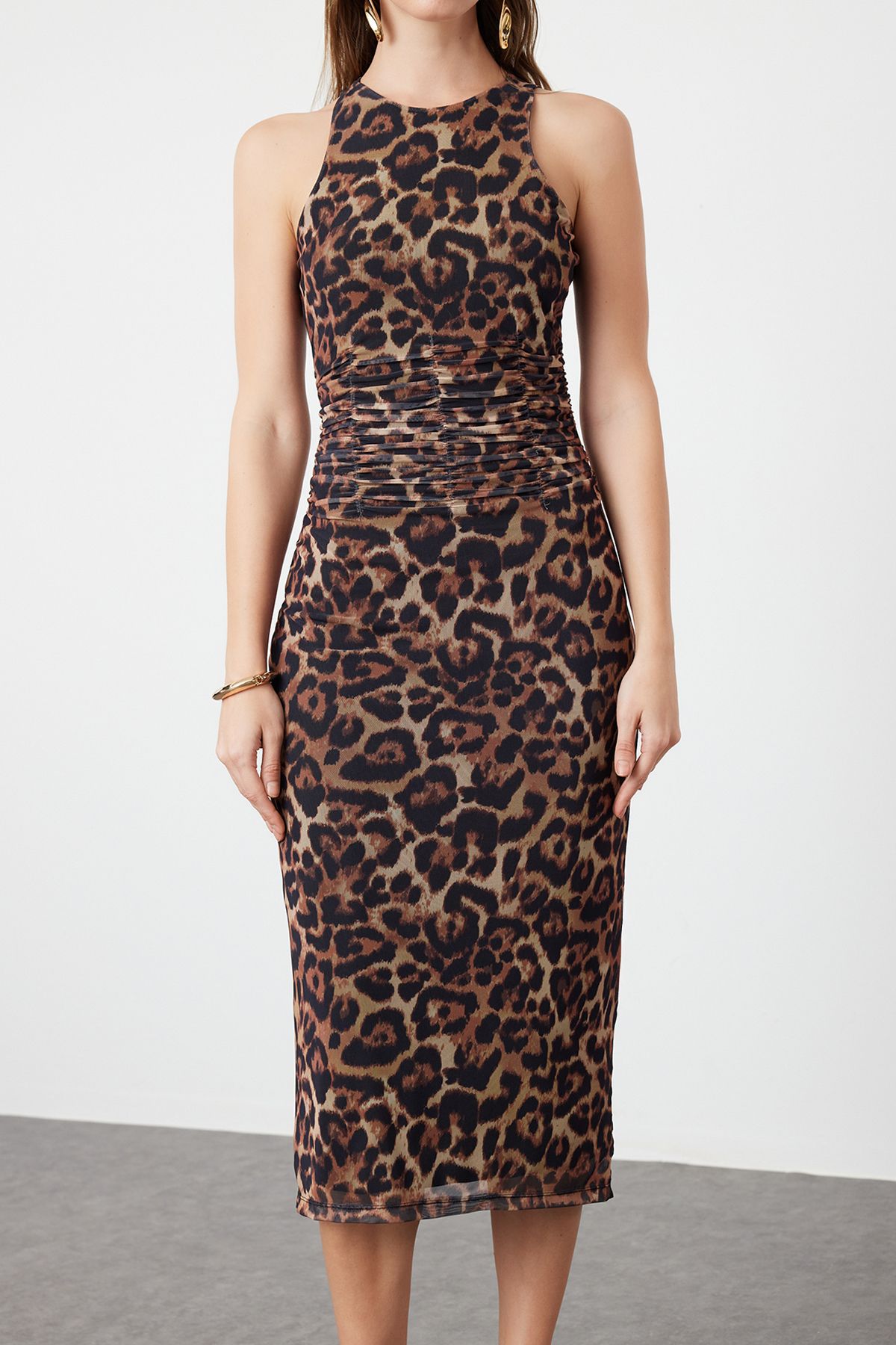 Kahverengi Çok Renkli Hayvan Desenli Leopar Örme Tül Şık Abiye Elbise TPRSS24EL00202