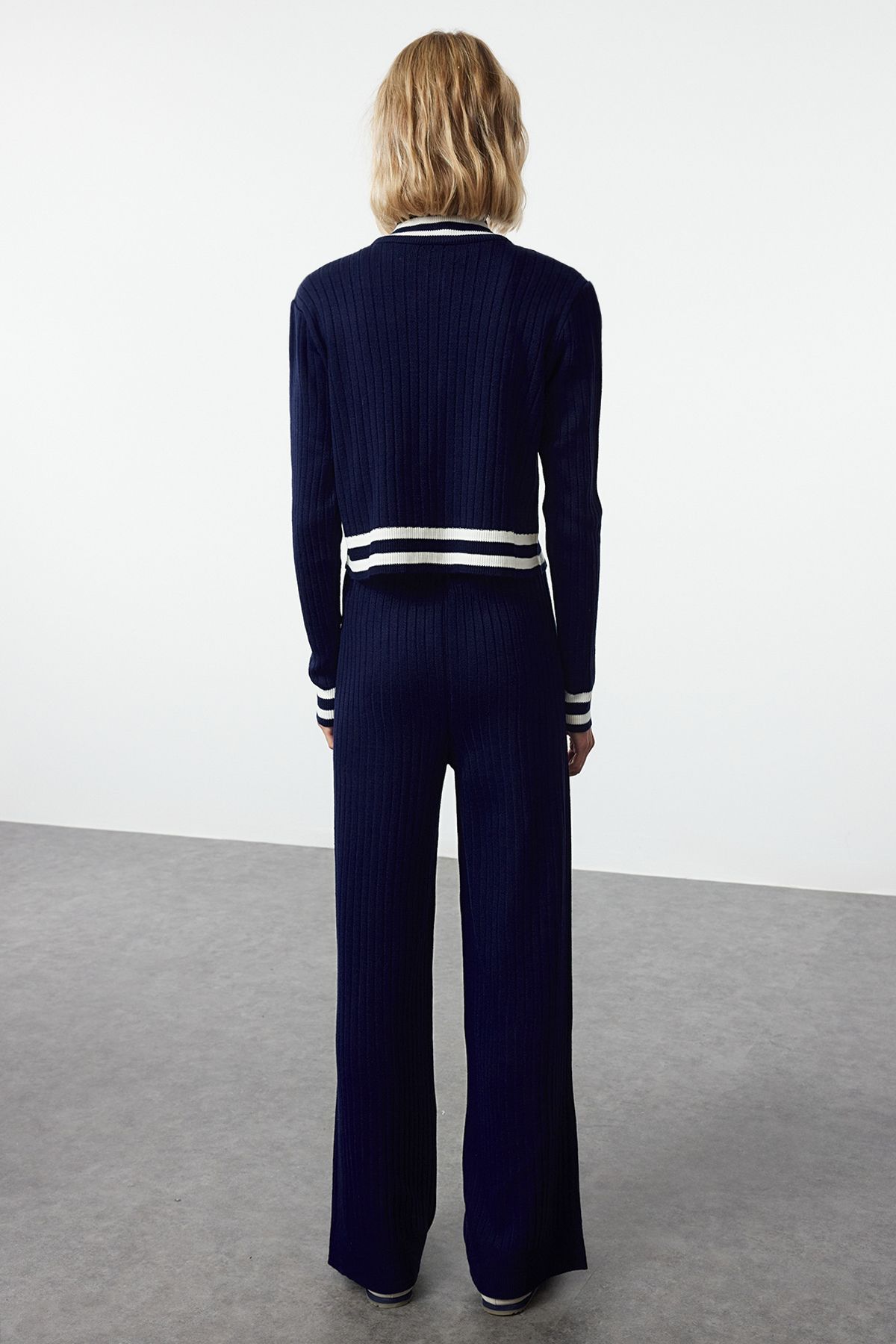 - The cardigan-and-pants combination seamlessly blends elegance and comfort.