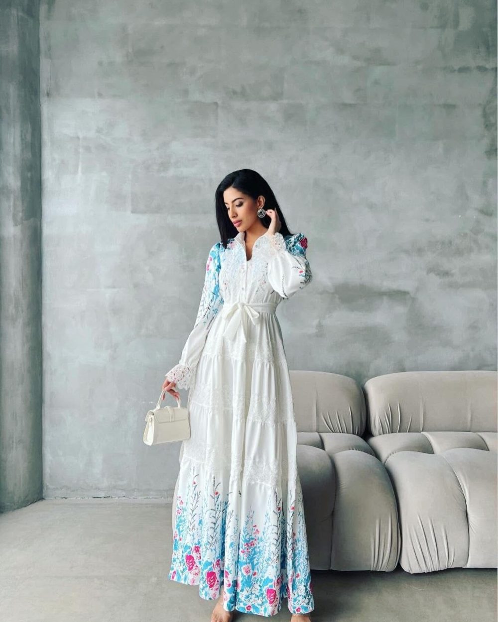 A cinched waist accentuates your figure, while the flowing skirt showcases a breathtaking floral gradient in soft hues of blue and pink, adding an artistic touch to this timeless piece. Featuring long sleeves with intricate lace-trimmed cuffs, this dress blends tradition with contemporary charm.