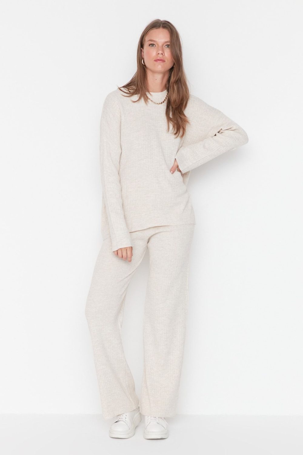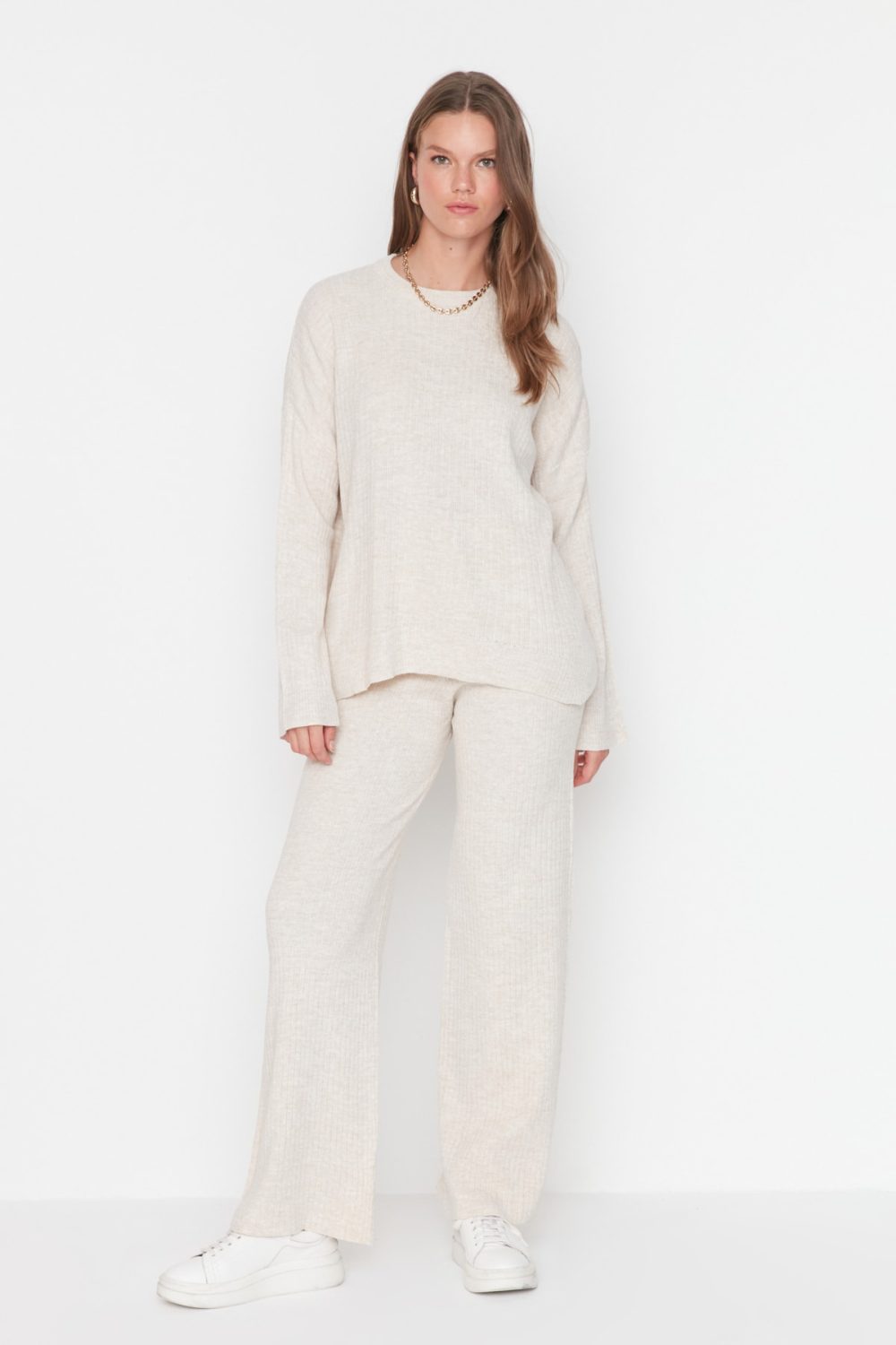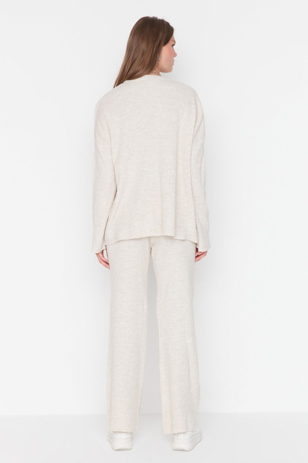 The sweater-and-pants set delivers a modern and elegant appearance while offering practical usability.