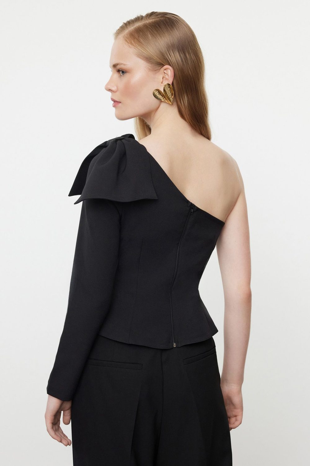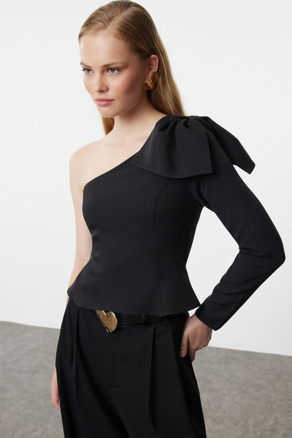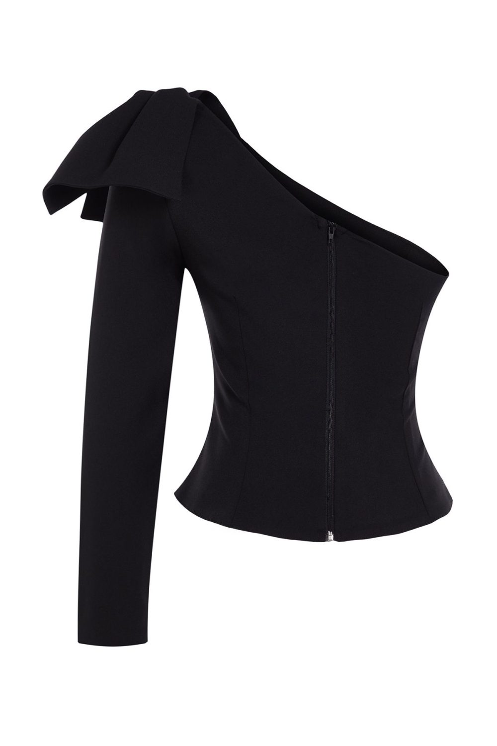 Bow details add feminine touches, bringing elegance to the blouse. With its single-sleeve design, it achieves a modern and minimalist appearance