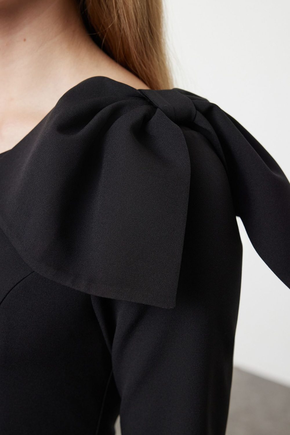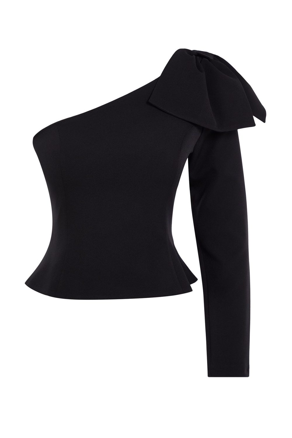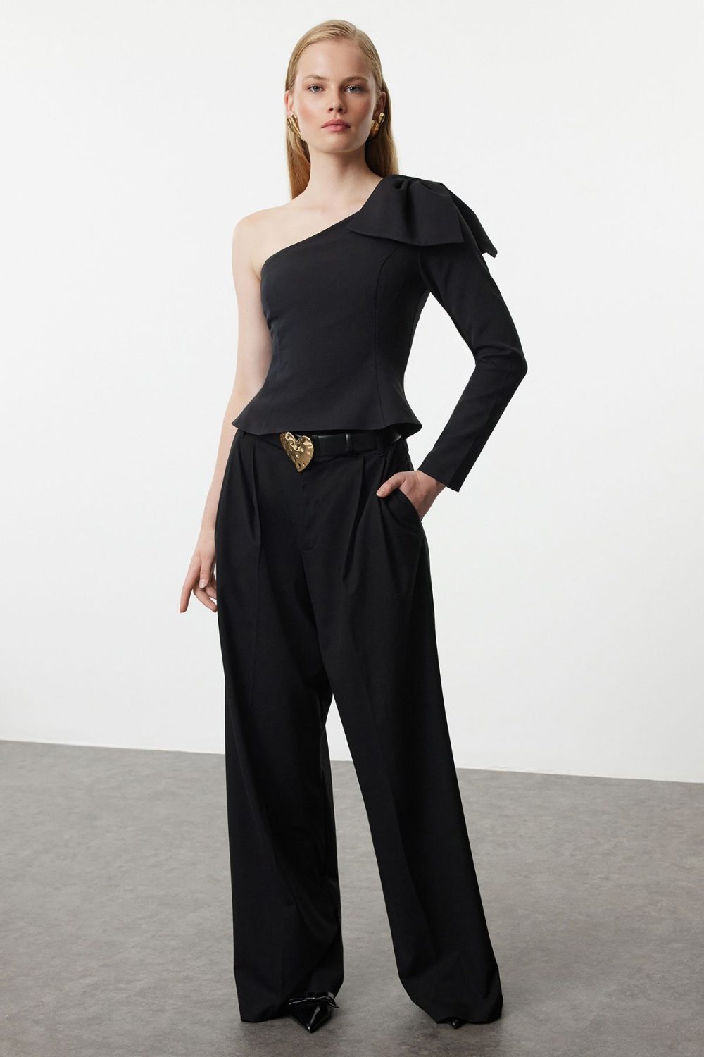 Bow details add feminine touches, bringing elegance to the blouse. With its single-sleeve design, it achieves a modern and minimalist appearance